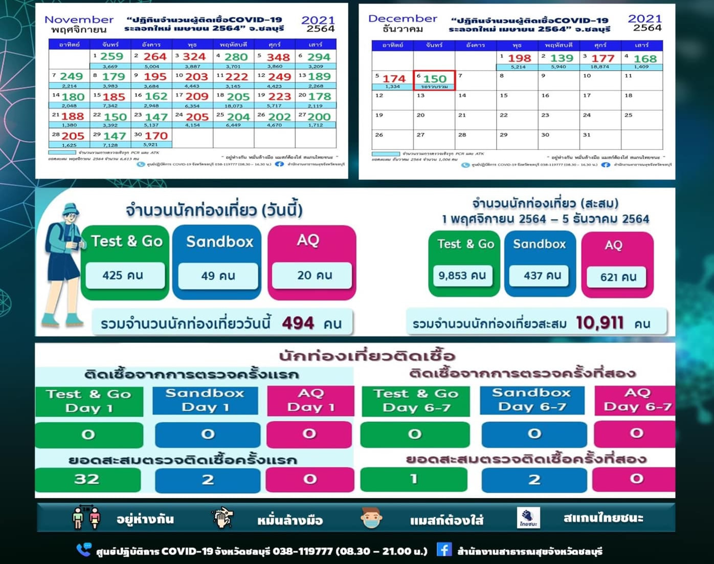 チョンブリ県174人陽性/ムアン18人/シラチャ44人/パタヤ74人[2021年12月5日]