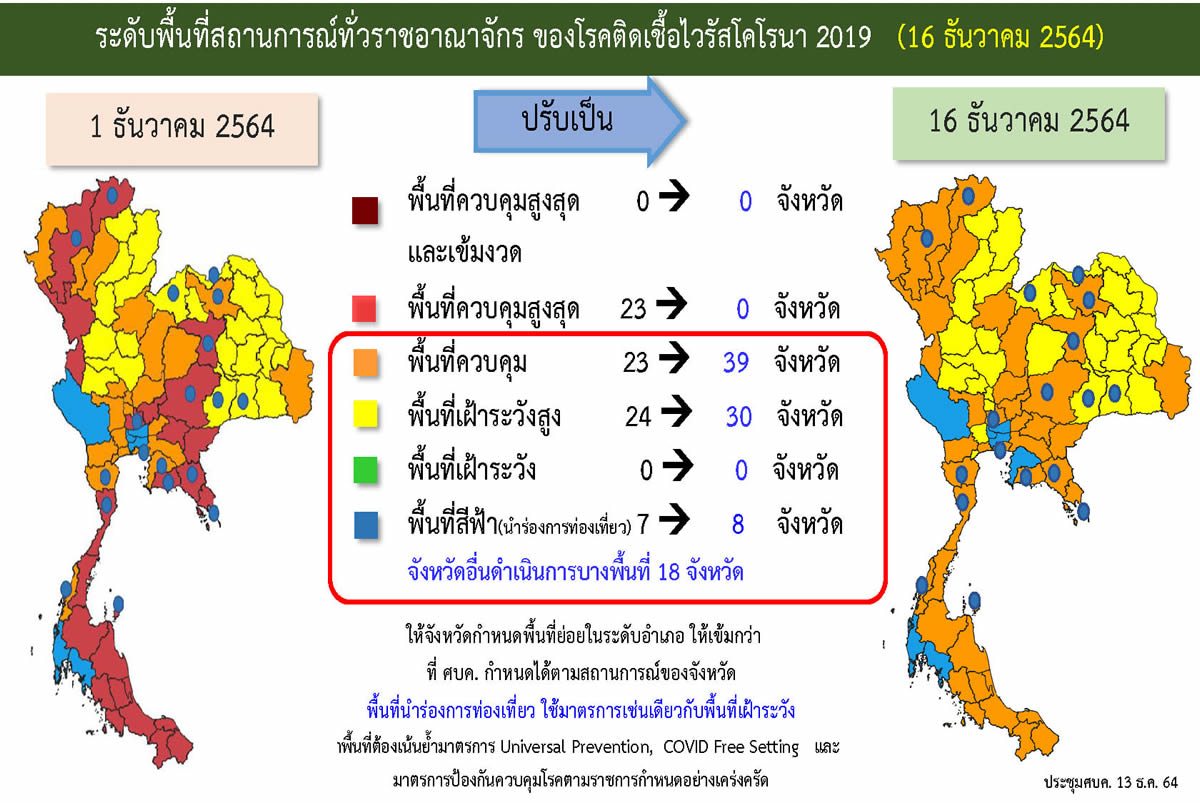 タイCOVID-19状況管理センター<the Centre for Covid-19 Situation Administration:CCSA>※は2021年12月15日(水)、タイ国内各都県における新型コロナウイルスの感染状況の変化に応じ、危険地域のゾーン分けの変更を決定・発表しました。12月16日より適用になります。