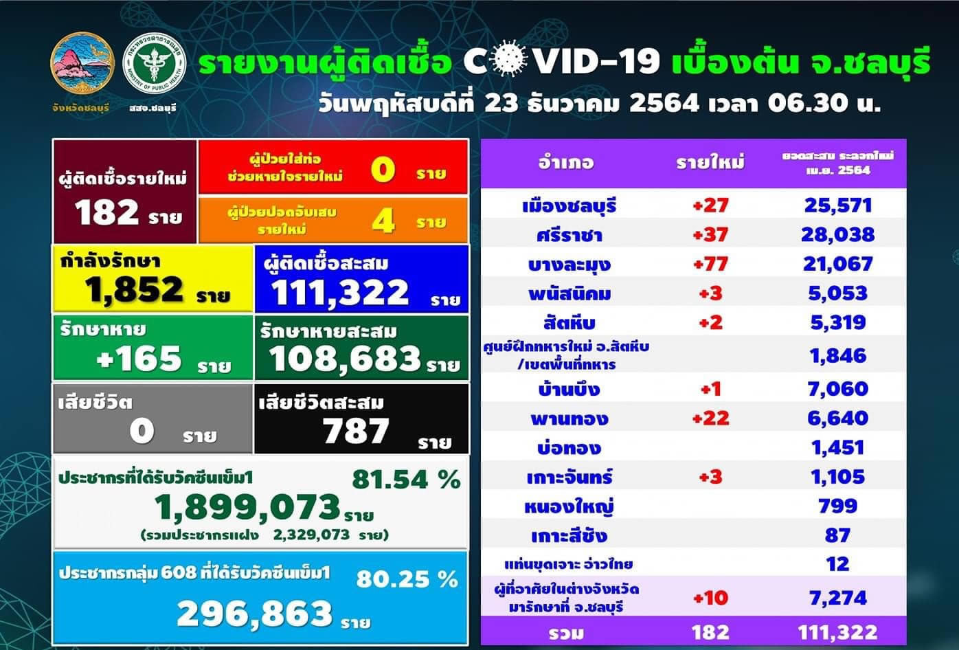 タイ東部チョンブリ県は2021年12月23日(木)朝6時半、新型コロナウイルスの最新の感染状況を発表しました。