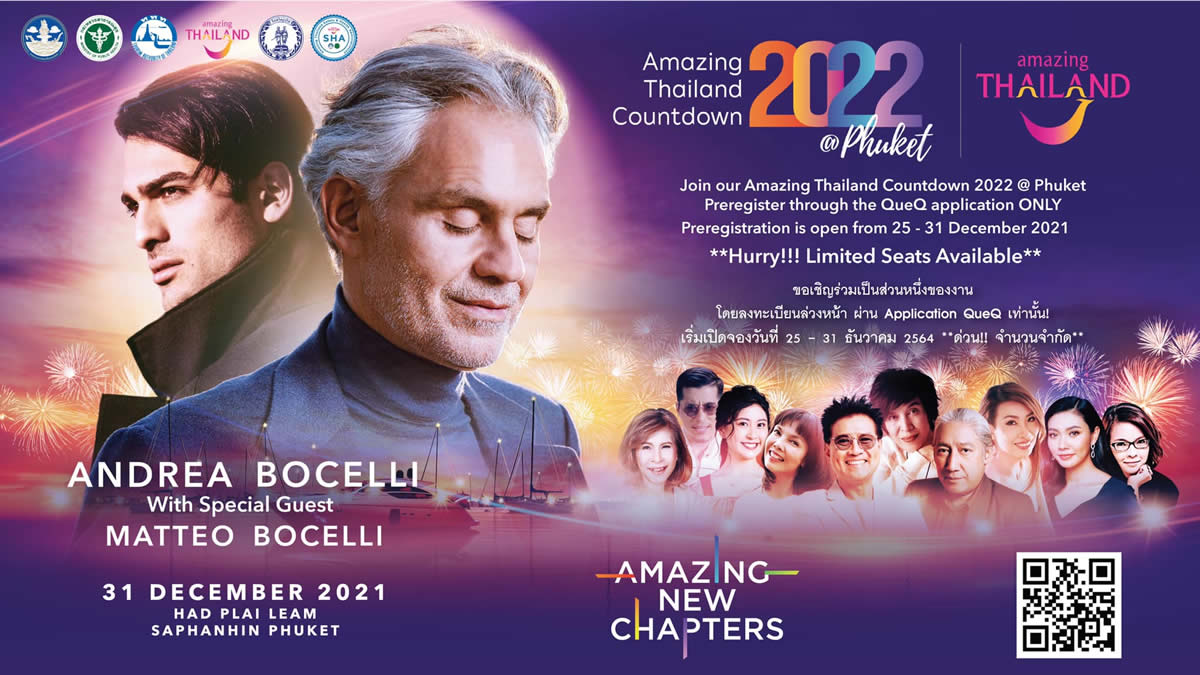 「アメージングタイランドカウントダウン2022@プーケット」の会場となるのは、ムアン地区のスパンヒン公園。「Amazing New Chapter @Phuket」というコンセプトの下、盲目のテノール歌手アンドレア・ボチェッリ(Andrea Bocelli)と息子のマッテオ・ボチェッリ(Matteo Bocelli)らを招聘し、タイの有名歌手との無料コンサートが開かれます。さらに「アンダマンの真珠」と銘打たれた壮大な光のショーも行われ、真夜中に2万発以上の花火が打ち上げられます。