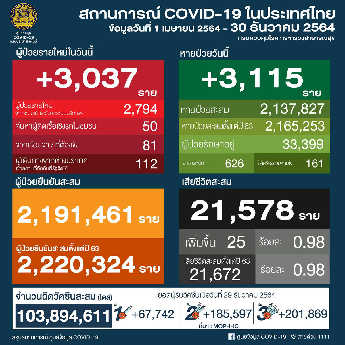 タイCOVID-19状況管理センター<the Centre for Covid-19 Situation Administration:CCSA>は2021年12月30日(木)、1日で新たに3,037人の新型コロナウイルス陽性者を確認したと発表しました。また、25人が死亡しています。回復したのは3,115人でした。