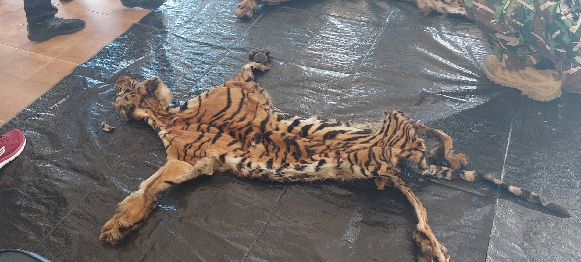 1月10日、国立公園職員がパトロール中に、グリルする準備ができている2頭のトラの死骸を発見し、そこにいた5人の男たちは逃走。その後、2頭のトラの毛皮などが見つかりました。