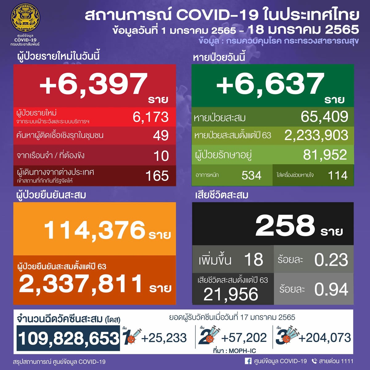 タイCOVID-19状況管理センター<the Centre for Covid-19 Situation Administration:CCSA>は2022年1月18日(火)、1日で新たに6,397人の新型コロナウイルス陽性者を確認したと発表しました。また、18人が死亡しています。回復したのは6,627人でした。