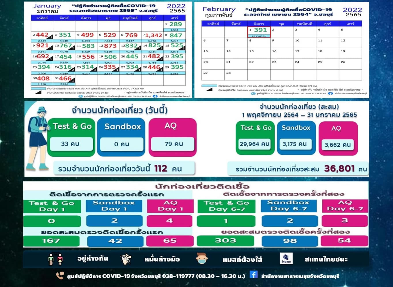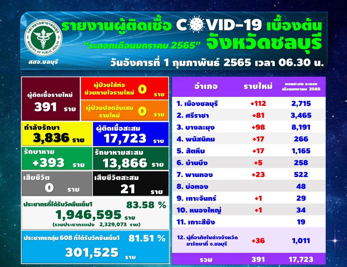 タイ東部チョンブリ県は2022年2月1日(火)朝6時半、新型コロナウイルスの最新の感染状況を発表しました。