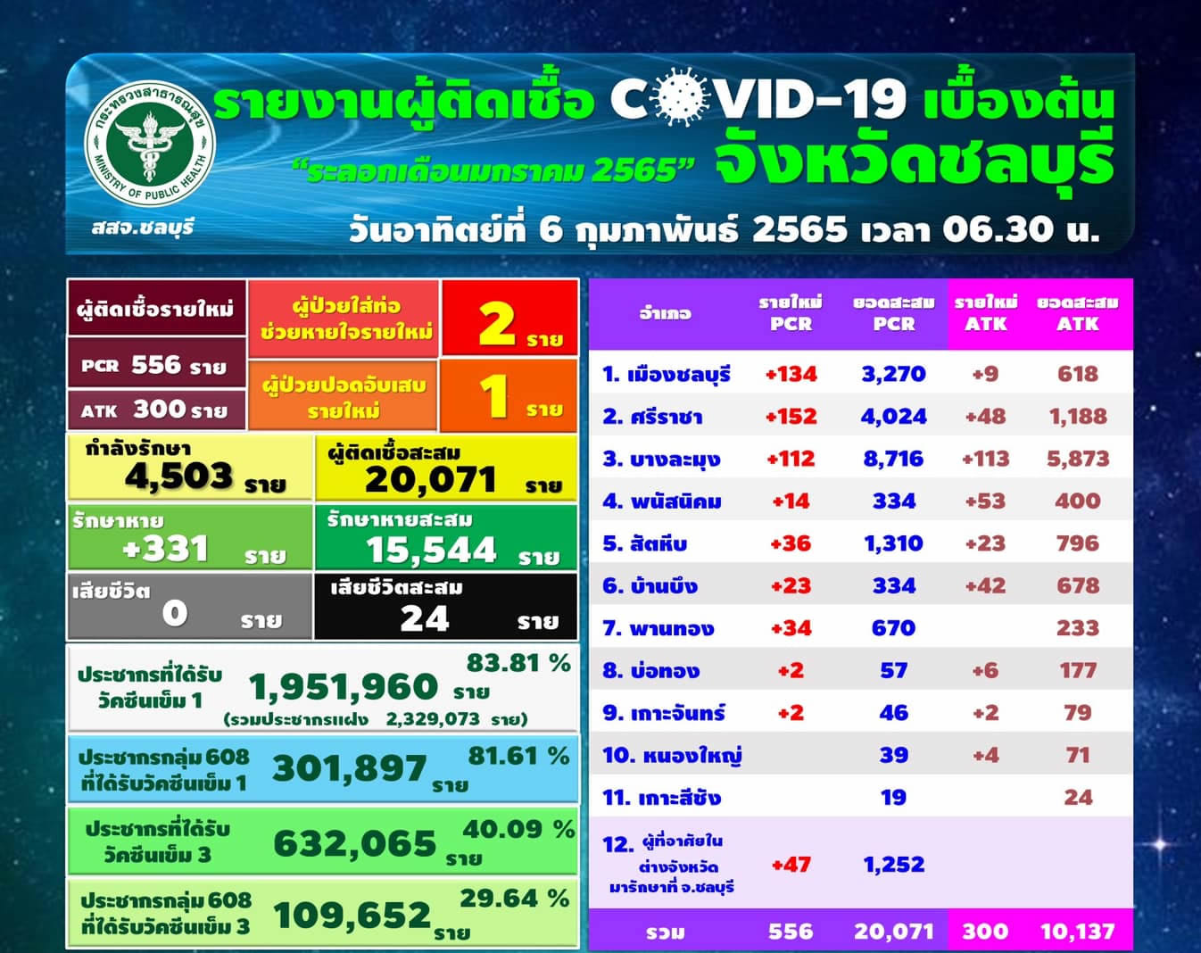 2022年1月以降チョンブリ県では、20,071人の陽性が確認され、24人が死亡。4,503人が現在も治療を続けています。