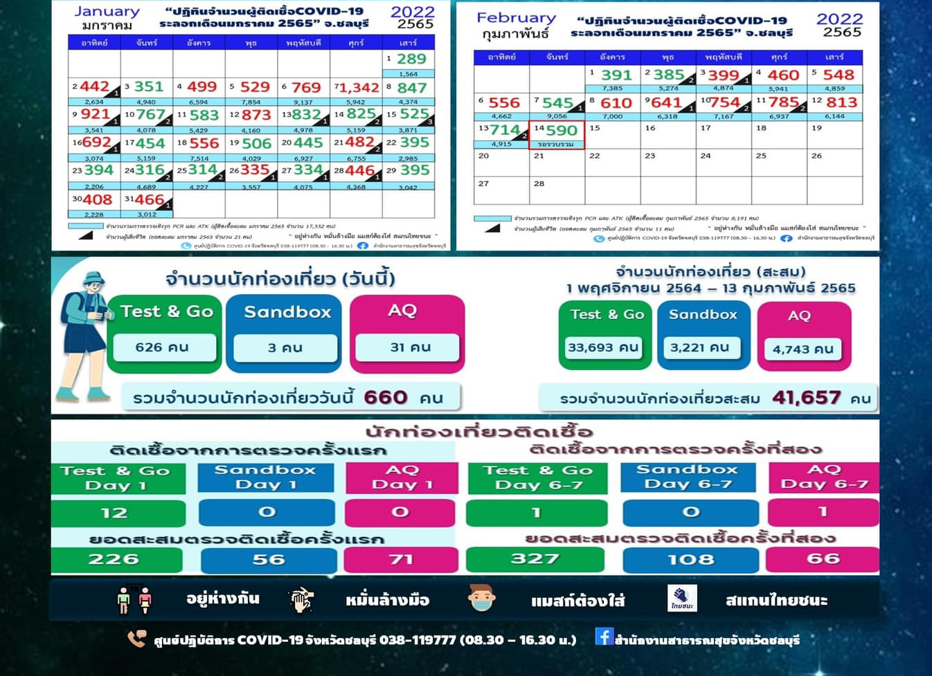 タイ東部チョンブリ県は2022年2月14日(月)朝6時半、新型コロナウイルスの最新の感染状況を発表しました。