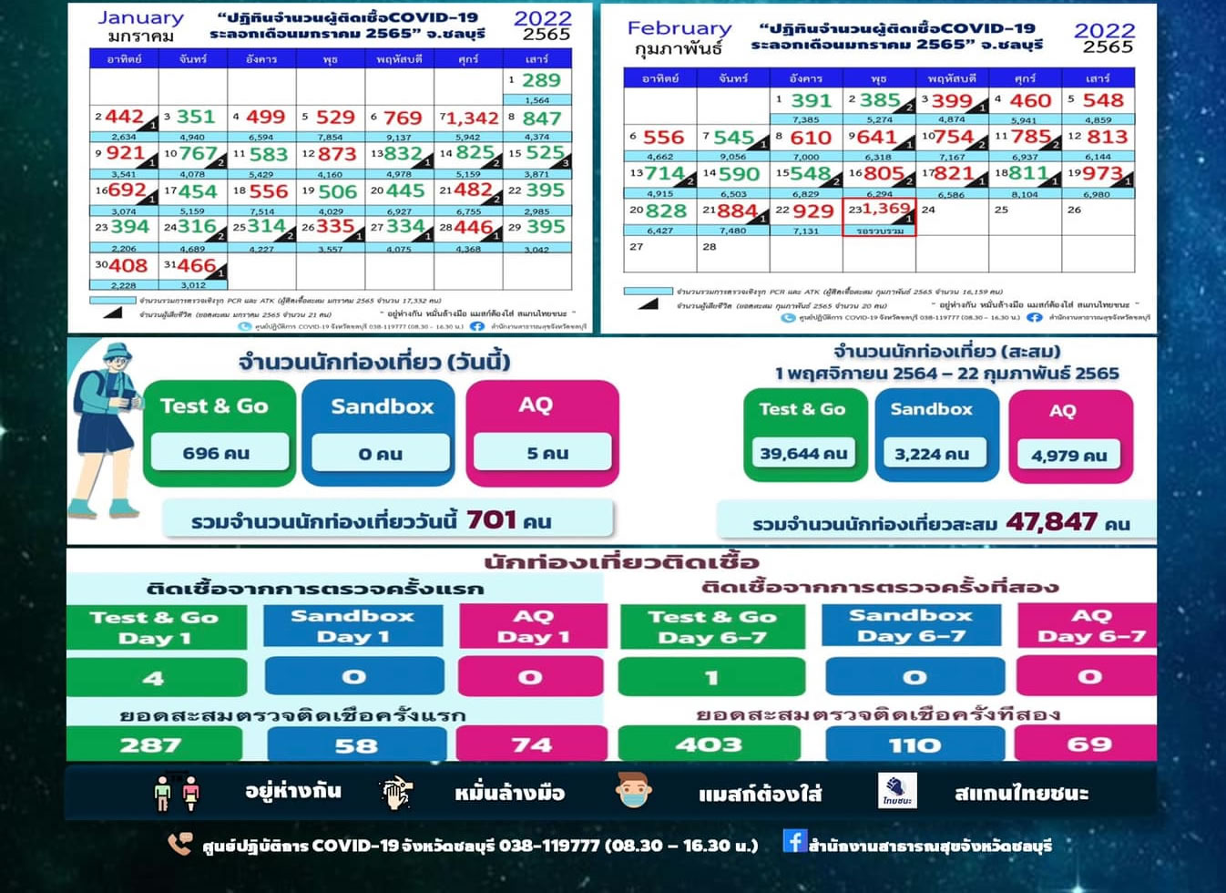 タイ東部チョンブリ県は2022年2月23日(水)朝6時半、新型コロナウイルスの最新の感染状況を発表しました。