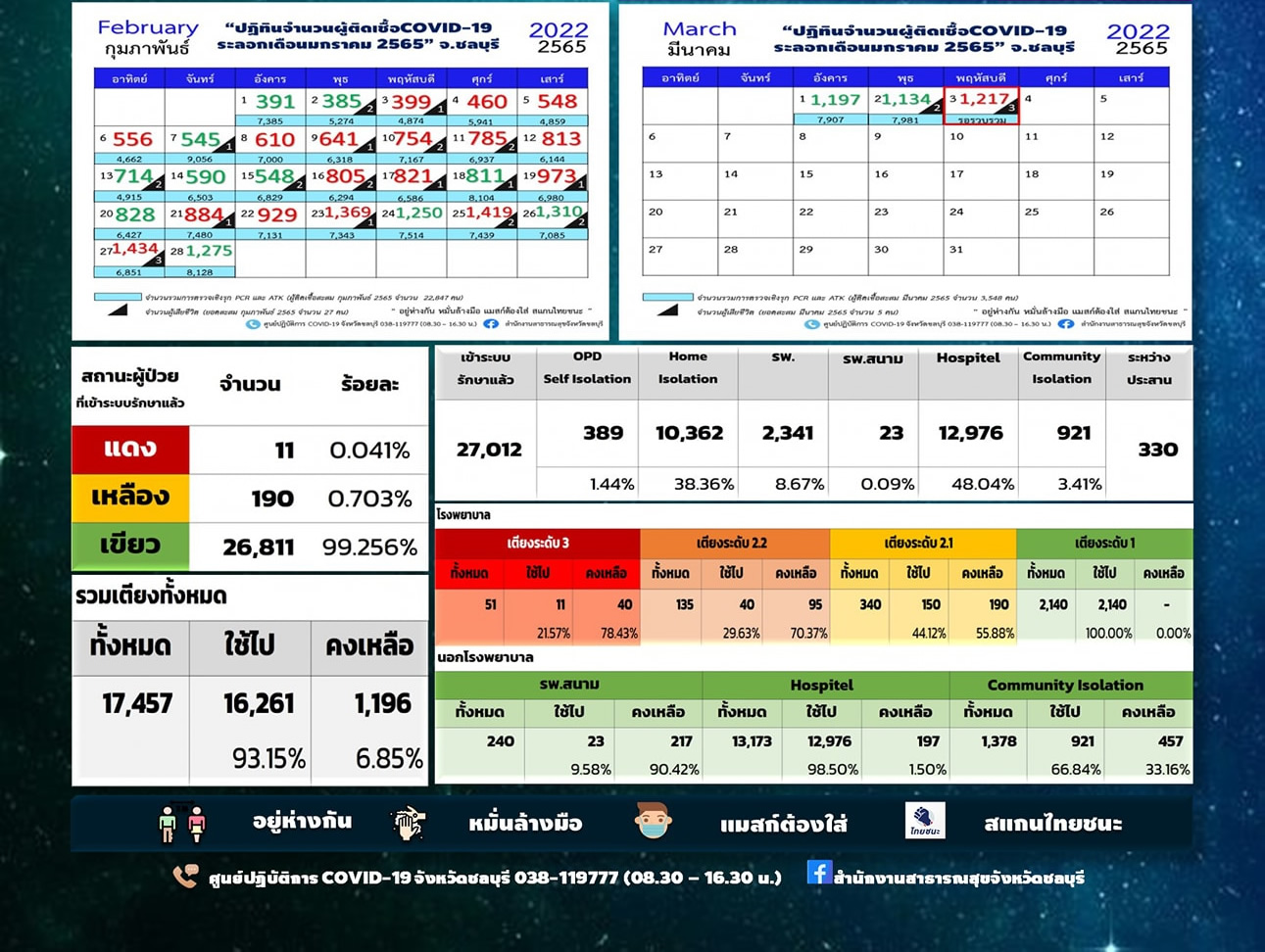 タイ東部チョンブリ県は2022年3月3日(木)朝6時半、新型コロナウイルスの最新の感染状況を発表しました。