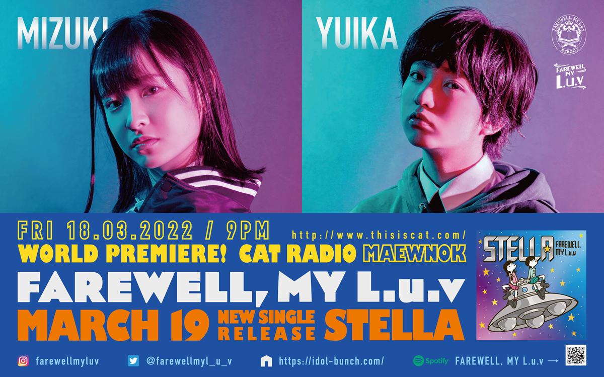 2021年12月にREBOOT始動したFAREWELL, MY L.u.v (フェアウェル マイ ラブ:フェアラブ)の最新シングル「STELLA」が2022年3月19日に配信リリースされますが、リリース前日となる3月18日には、タイのラジオ局Cat Radioにて「STELLA」がワールドプレミアオンエアされることが決定しました。
