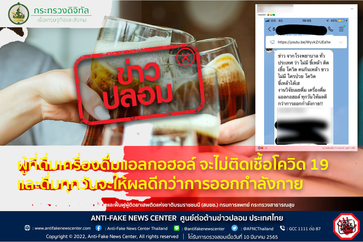 アンチフェイクニュースセンターによると、SNSで拡散された「お酒を飲む人は新型コロナウイルスに感染せず、毎日飲むと運動よりも良い結果が得られる」という情報について調査を実施。保健省等に確認をしたところ、虚偽の情報であることが明らかになりました。