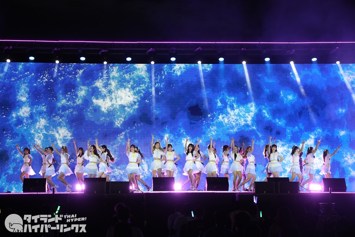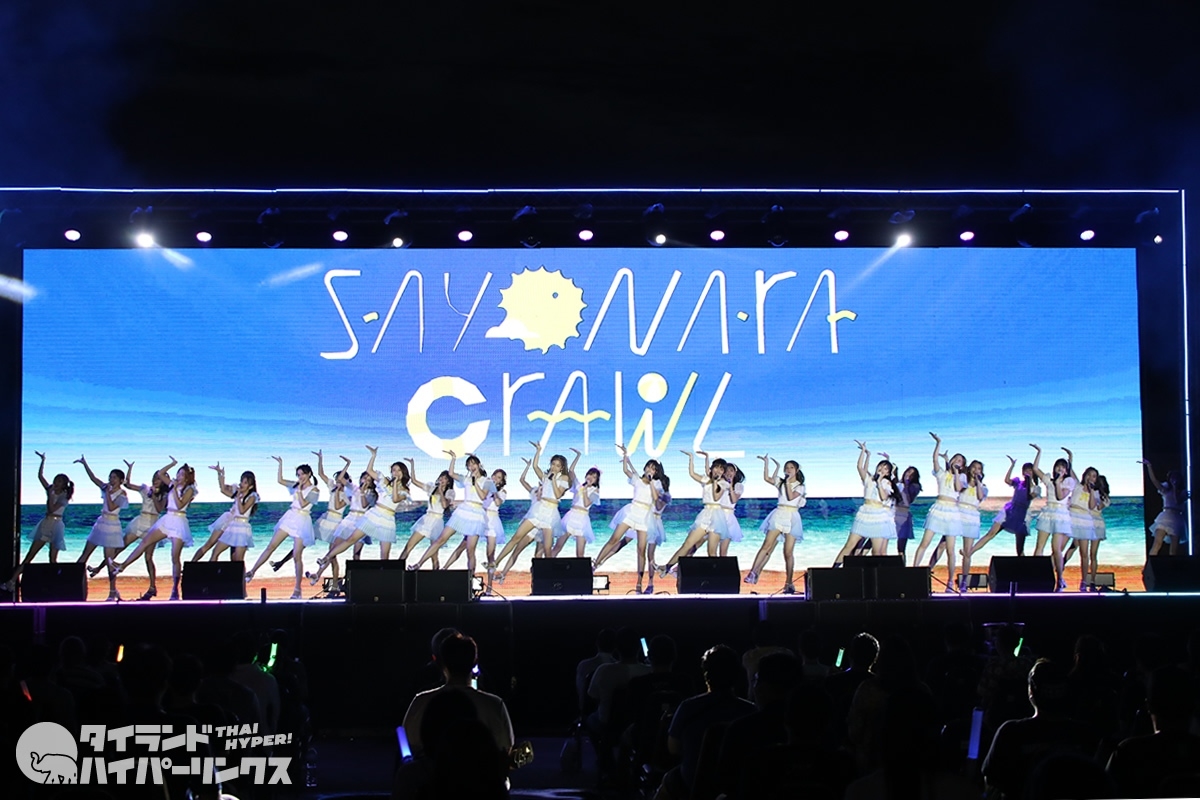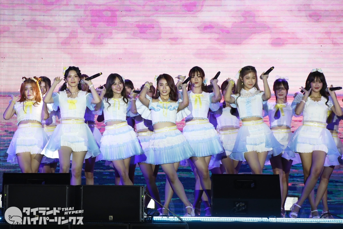生憎この日のバンコクは道路が冠水するほどの豪雨に見舞われましたが、お披露目イベントの直前には天気が回復し、30分遅れの午後6時にスタート。3期生による「First Rabbit」や「ヘビーローテーション」などが披露された後、BNK48とCGM48からの選抜メンバー32人による「さよならクロール」が初披露されました。なお、センターを務めたのはミュージックBNK48、フォンBNK48、シャンプーCGM48、パーエヤーBNK48の4人です。