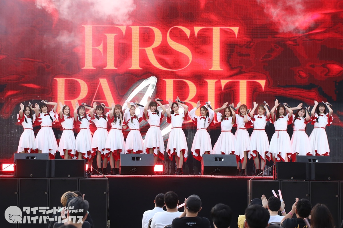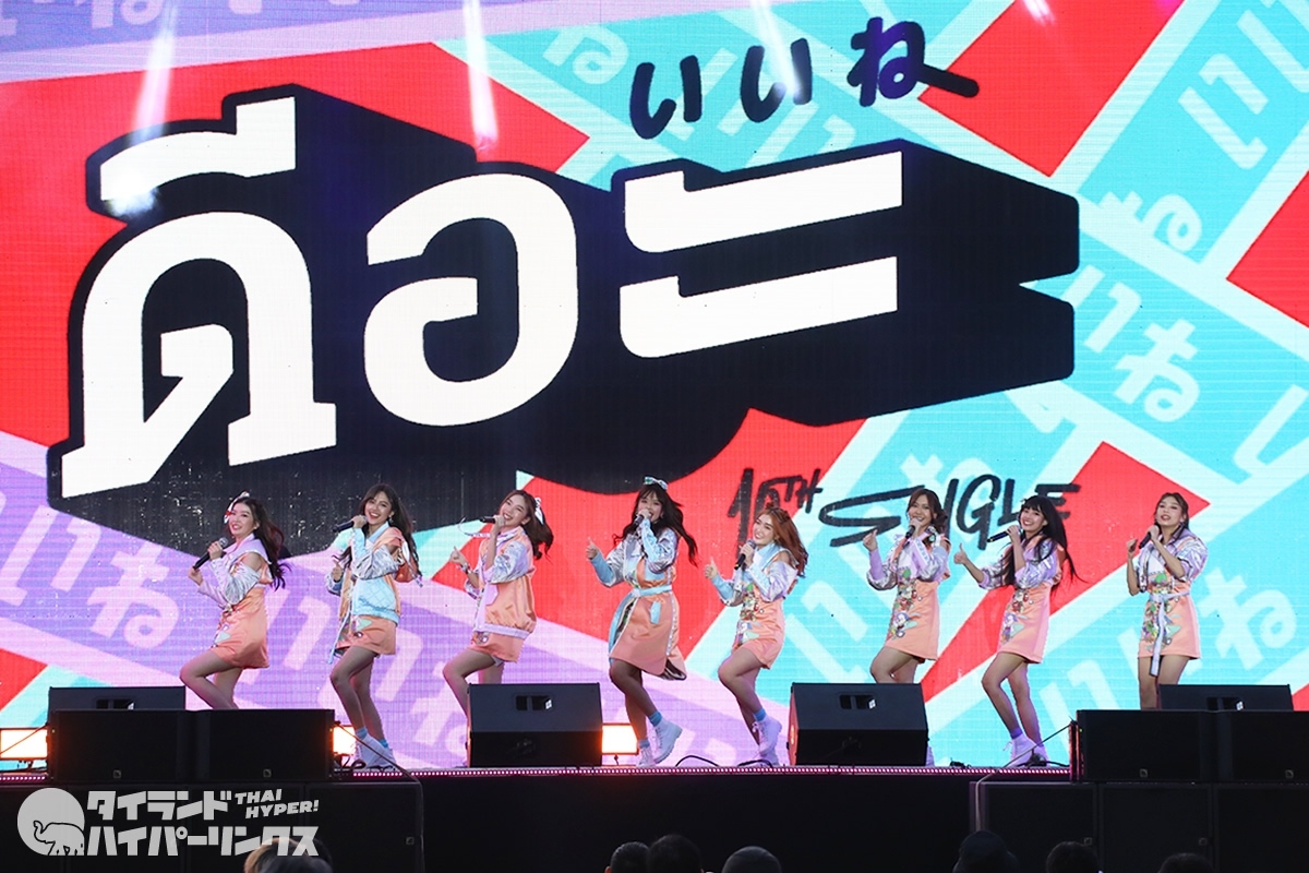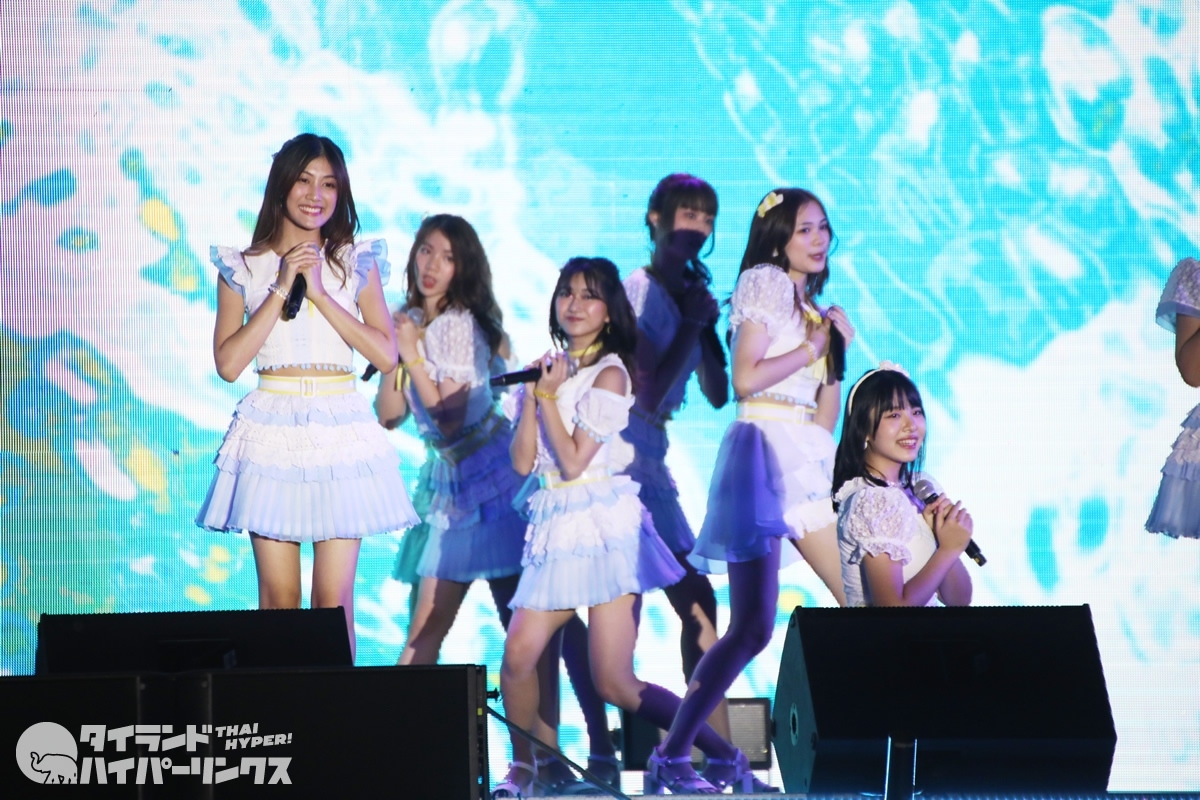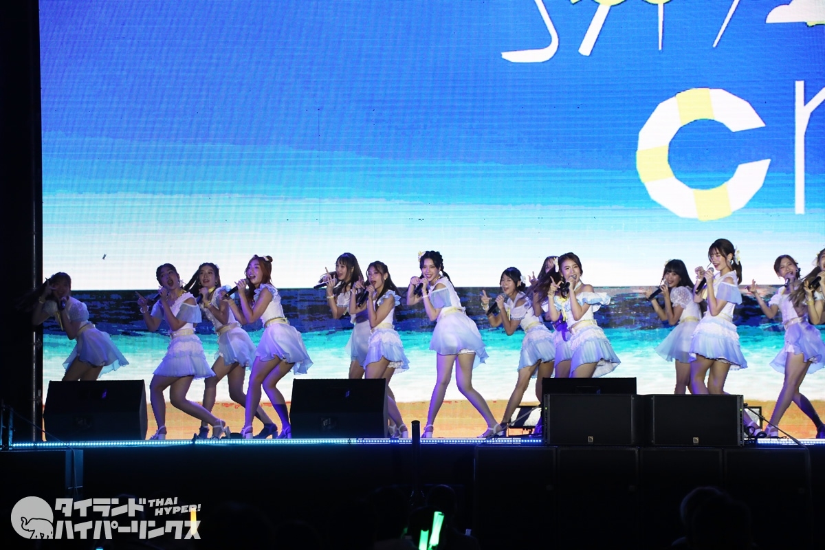 生憎この日のバンコクは道路が冠水するほどの豪雨に見舞われましたが、お披露目イベントの直前には天気が回復し、30分遅れの午後6時にスタート。3期生による「First Rabbit」や「ヘビーローテーション」などが披露された後、BNK48とCGM48からの選抜メンバー32人による「さよならクロール」が初披露されました。なお、センターを務めたのはミュージックBNK48、フォンBNK48、シャンプーCGM48、パーエヤーBNK48の4人です。