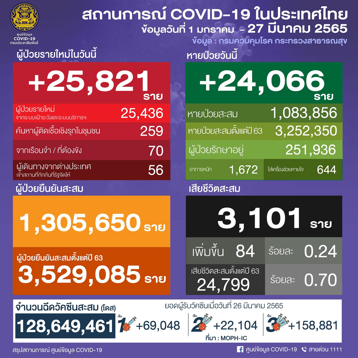 タイCOVID-19状況管理センター<the Centre for Covid-19 Situation Administration:CCSA>は2022年3月27日(日)、1日で新たに25,821人の新型コロナウイルス陽性者を確認したと発表しました。また、84人が死亡しています。回復したのは24,066人でした。