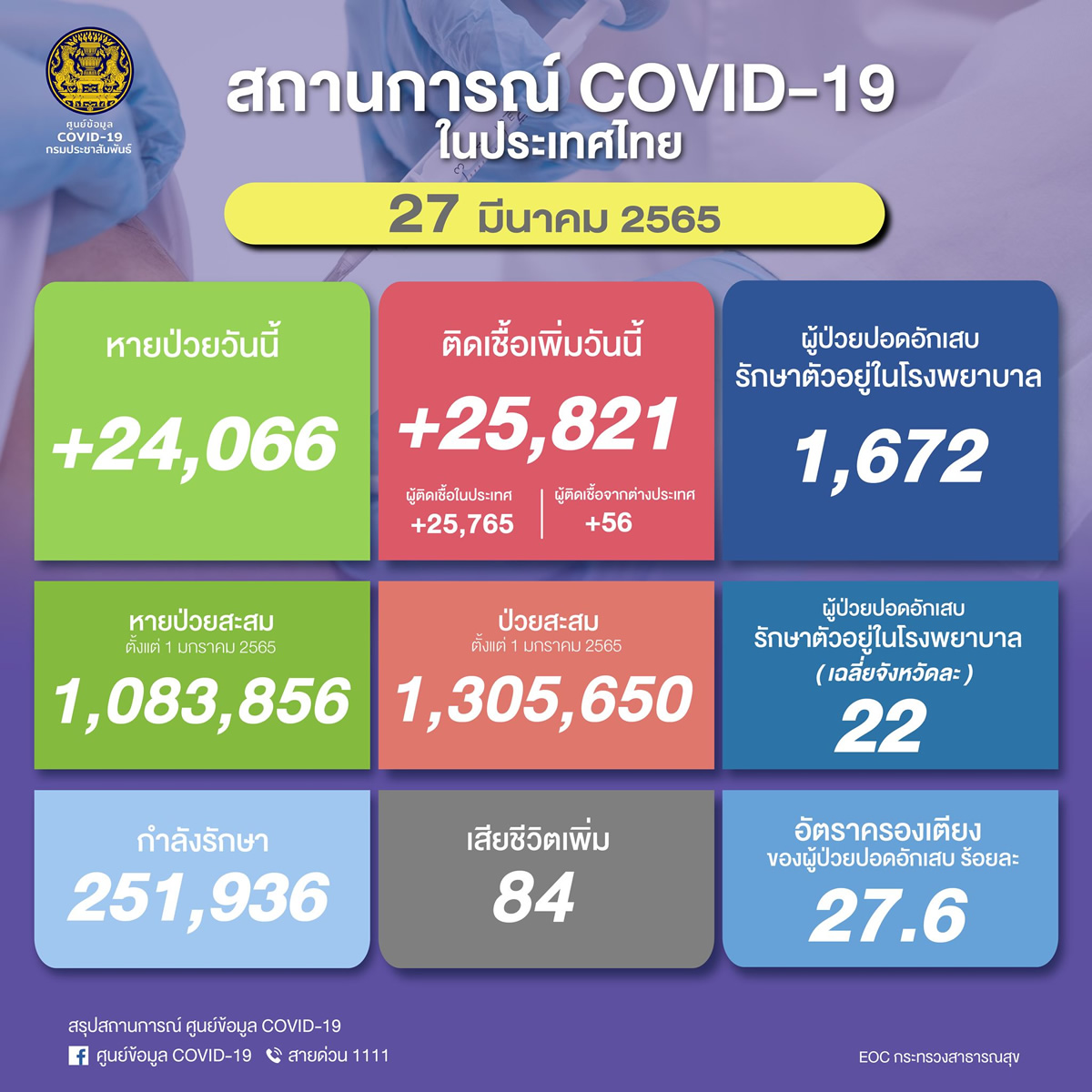 タイ保健省は2022年3月27日(日)朝、1日で確認された新型コロナウイルス陽性者が25,821人で84人が死亡したと発表しました。また、回復したのは24,066人です。