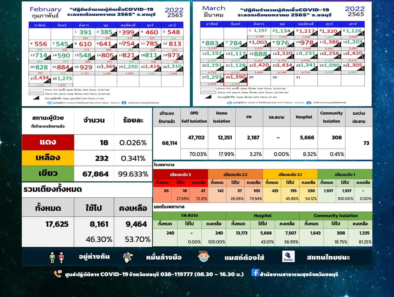 タイ東部チョンブリ県は2022年3月28日(月)朝6時半、新型コロナウイルスの最新の感染状況を発表しました。