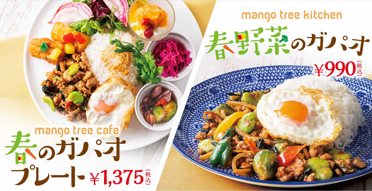 タイ・バンコクに本店をもつ「マンゴツリー」の姉妹店で本格タイ料理を日常的に楽しめる「マンゴツリーカフェ」。2022年4月1日(金)からは「春のガパオプレート」をが販売されます。また「マンゴツリーキッチン」では「春野菜のガパオ」が販売されます。