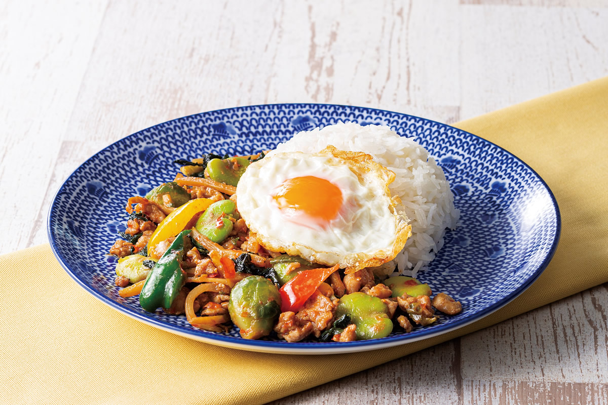 そら豆や芽キャベツ、赤・緑ピーマンをごろっと入れた、野菜の食感も楽しめる春らしいカラフルな「鶏のガパオ」は食べ応え十分、仕事の合間や会社帰りのサクッとごはんにぴったりです。