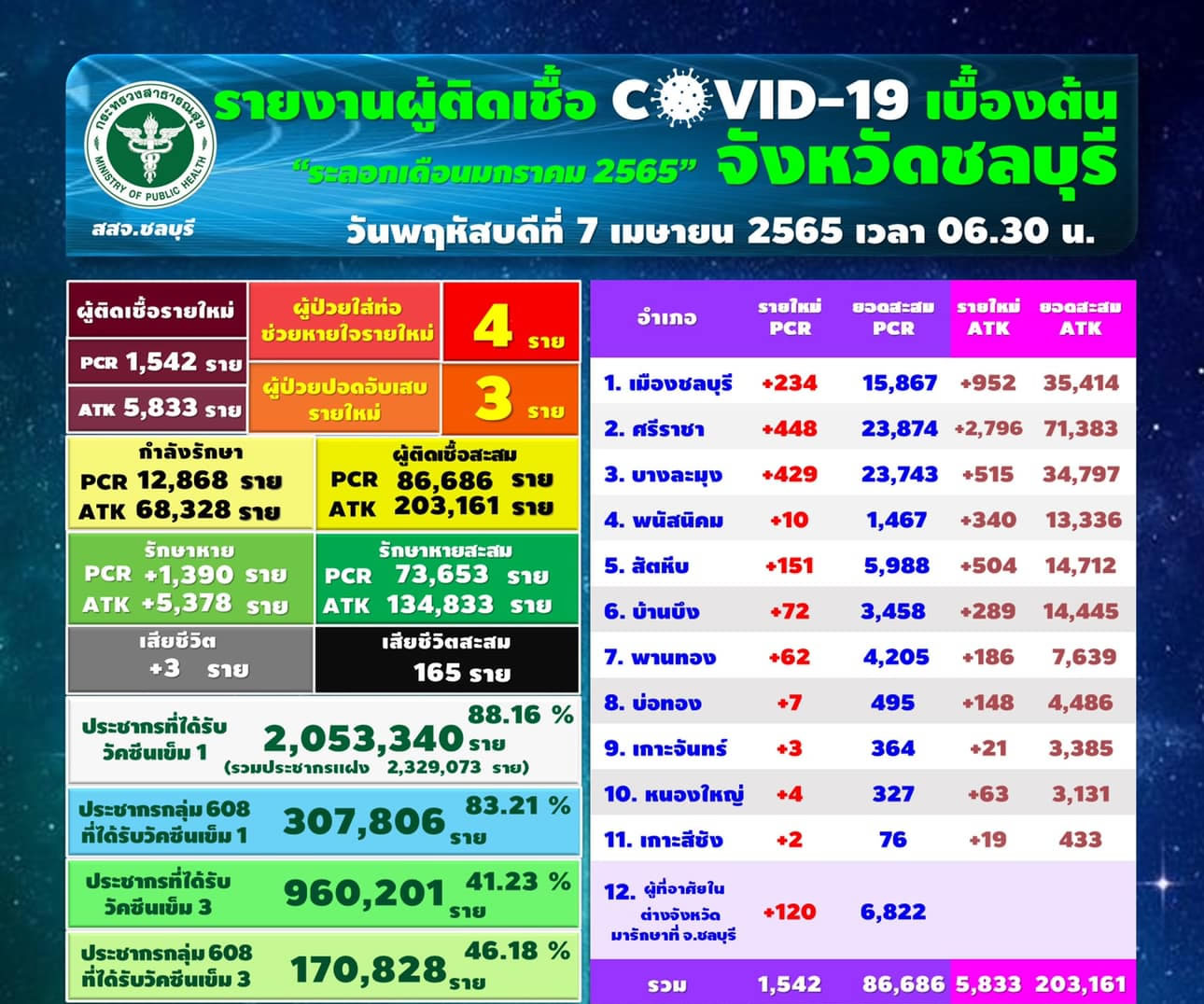 タイ東部チョンブリ県は2022年4月7日(木)朝6時半、新型コロナウイルスの最新の感染状況を発表しました。
