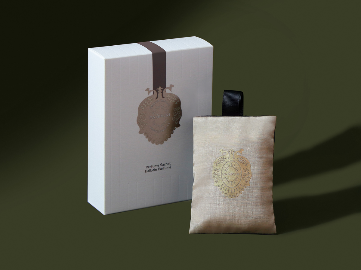 ・パンピューリのエンブレム〈孔雀〉が印象的な美しいサシェ