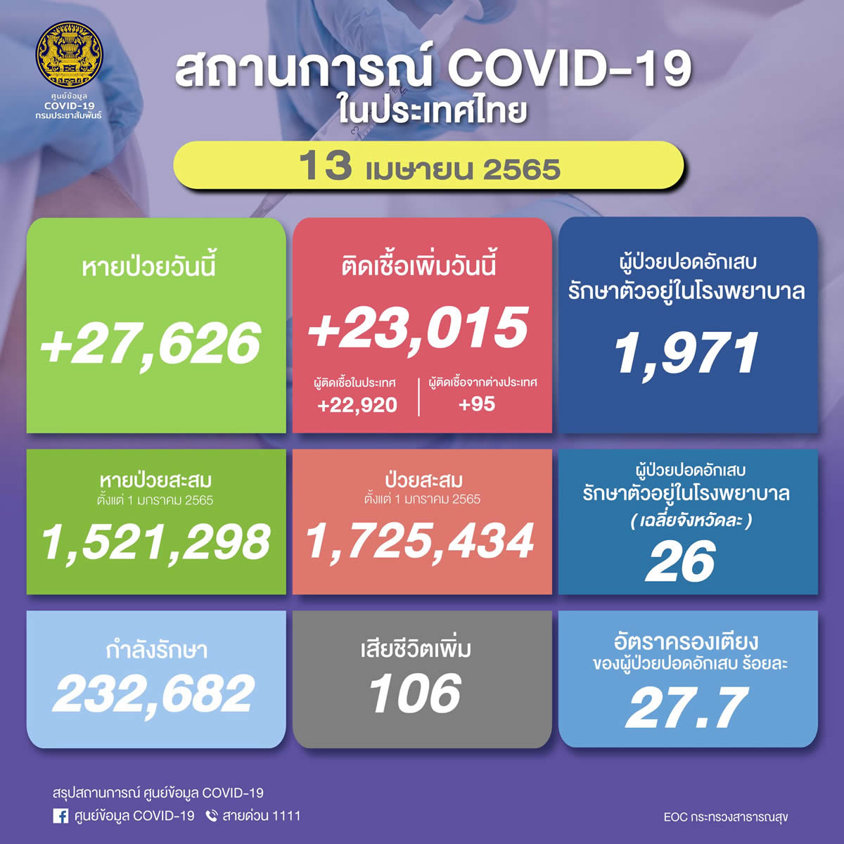 タイ保健省は2022年4月13日(水)朝、1日で確認された新型コロナウイルス陽性者が23,015人で、106人が死亡したと発表しました。また、回復したのは27,626人です。