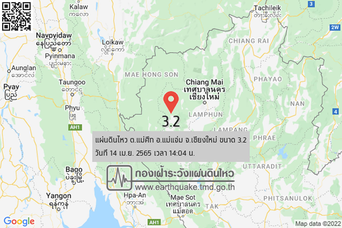 タイ気象局地震監視部によると、2022年4月14日14時4分にチェンマイ県メーチェムで、マグニチュード3.2の地震が発生しました。震源の深さは1キロ。