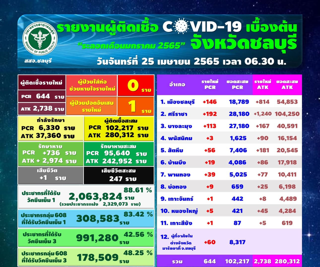 チョンブリ県608人陽性/ムアン135人/シラチャ175人/パタヤ129人[2022年4月24日]