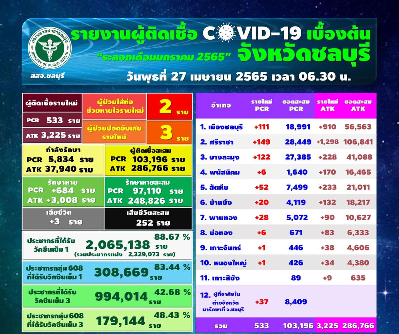 発表によると、チョンブリ県内で新たに1日で確認された新型コロナウイルス陽性者は、PCR検査で陽性となったのが533人で、ATK検査で陽性となったのが3,225人。死亡者が3人でした。