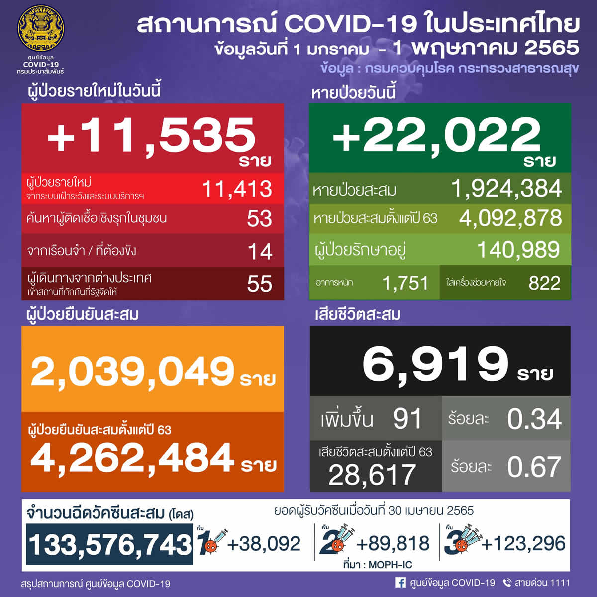 タイCOVID-19状況管理センター<the Centre for Covid-19 Situation Administration:CCSA>は2022年5月1日(日)、1日で新たに11,535人の新型コロナウイルス陽性者を確認したと発表しました。また、91人が死亡しています。回復したのは22,022人でした。