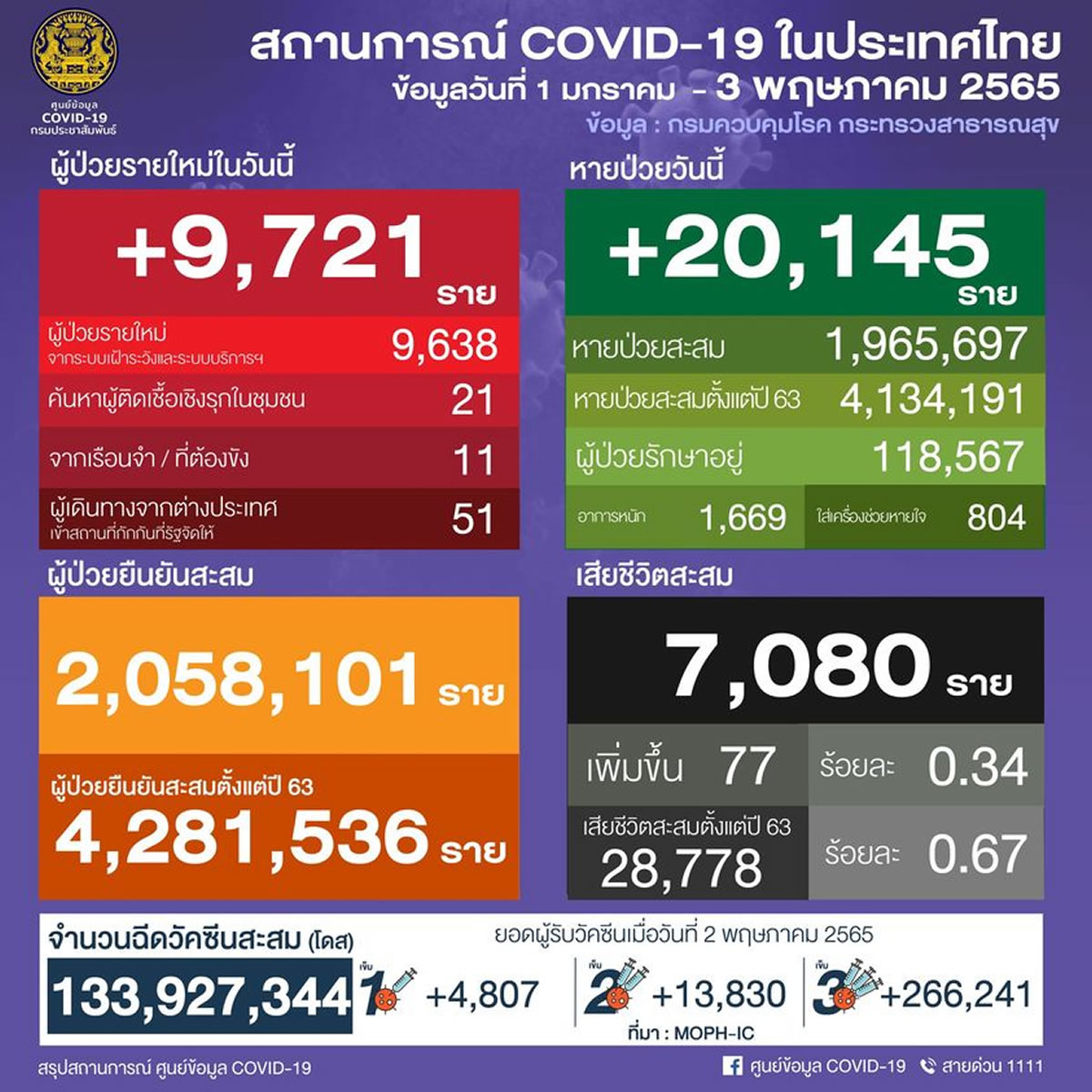 タイCOVID-19状況管理センター<the Centre for Covid-19 Situation Administration:CCSA>は2022年5月3日(火)、1日で新たに9,721人の新型コロナウイルス陽性者を確認したと発表しました。また、77人が死亡しています。回復したのは20,145人でした。