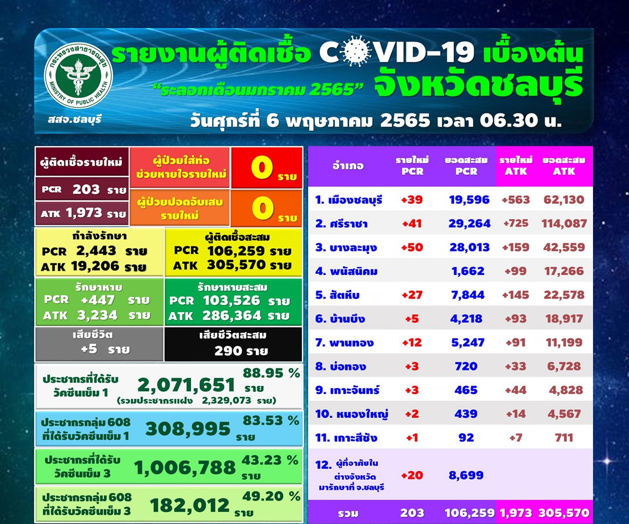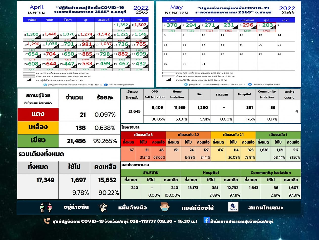 タイ東部チョンブリ県は2022年5月6日(金)早朝、新型コロナウイルスの最新の感染状況を発表しました。