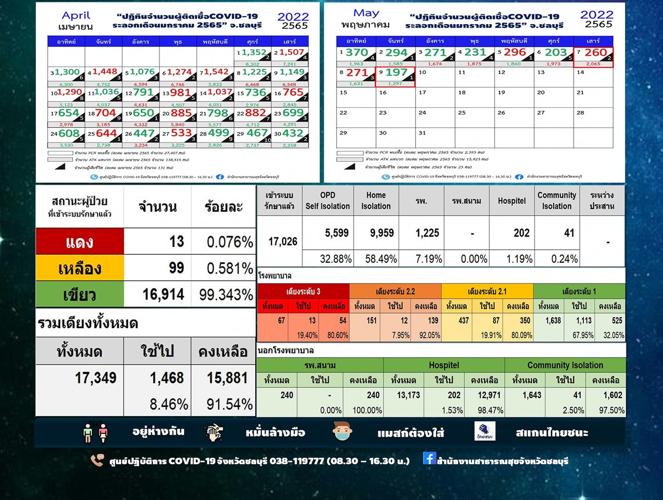 タイ東部チョンブリ県は2022年5月9日(月)早朝、新型コロナウイルスの最新の感染状況を発表しました。