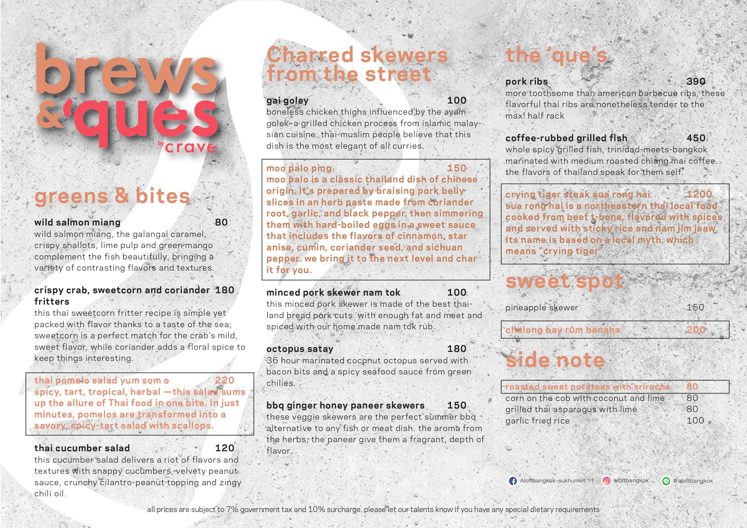 バンコクのスクンビットを見下ろす屋外テラス「brews & ‘ques by Crave」は、アメリカ風のバーベキュー場で、ユニークなアジア風のアレンジが施されています。特製ドリンクを飲みながら、街のパノラマの景色を眺めながら静かな夜を楽しめます。