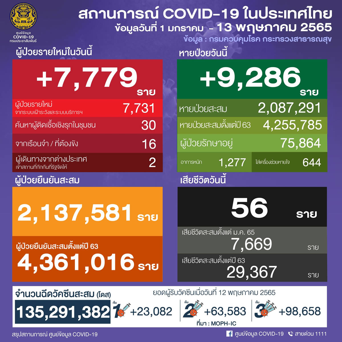 タイCOVID-19状況管理センター<the Centre for Covid-19 Situation Administration:CCSA>は2022年5月13日(金)、1日で新たに7,779人の新型コロナウイルス陽性者を確認したと発表しました。また、56人が死亡しています。回復したのは9,286人でした。