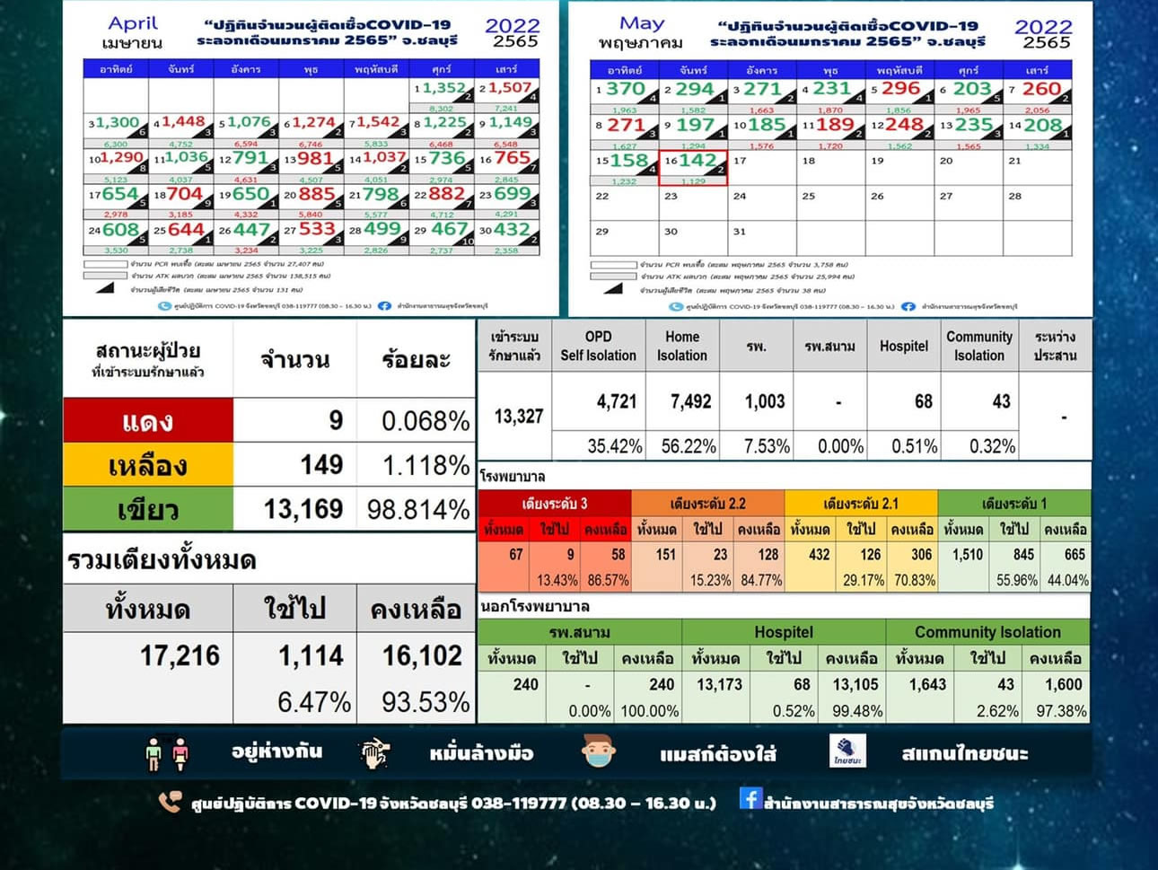 タイ東部チョンブリ県は2022年5月16日(月)早朝、新型コロナウイルスの最新の感染状況を発表しました。