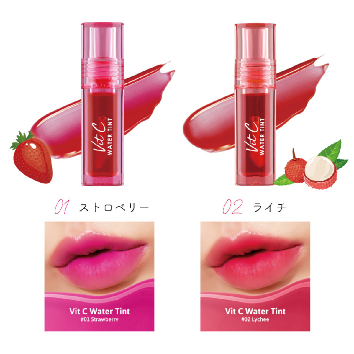 「Vit C ウォーターティント」は、92%以上の天然水(ミネラルウォーター)とフルーツエキスから生まれた、果汁感ウォーターティントリップ。