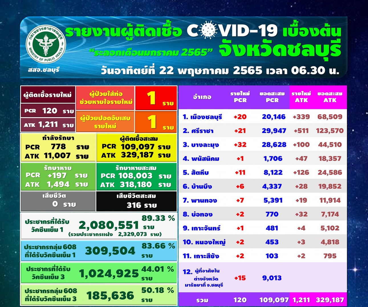 タイ東部チョンブリ県は2022年5月22日(日)早朝、新型コロナウイルスの最新の感染状況を発表しました。