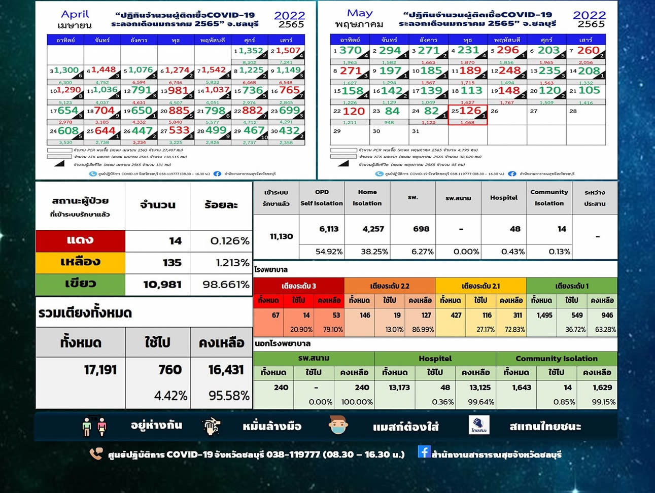 タイ東部チョンブリ県は2022年5月25日(水)早朝、新型コロナウイルスの最新の感染状況を発表しました。