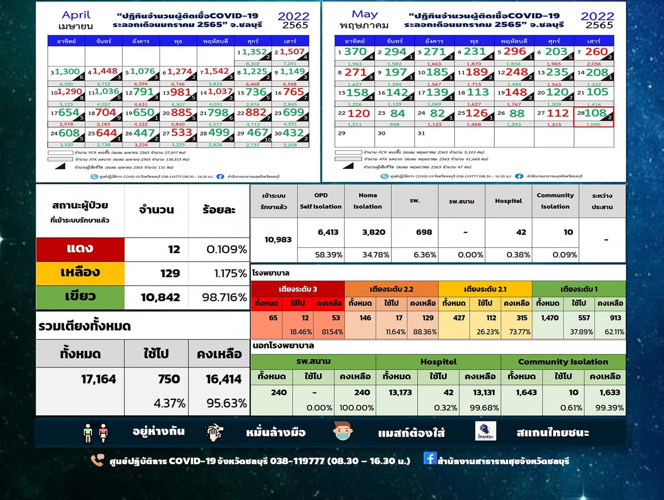 タイ東部チョンブリ県は2022年5月28日(土)早朝、新型コロナウイルスの最新の感染状況を発表しました。