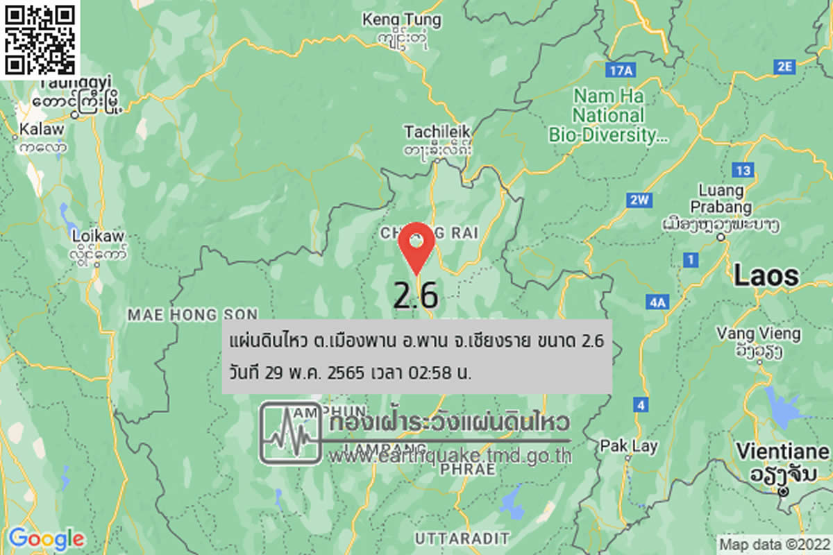 タイ北部チェンライ県パーンのムアンパーンで2022年5月29日(日)午前2時58分、マグニチュード2.6の地震が発生しました。 震源の深さは4キロ。