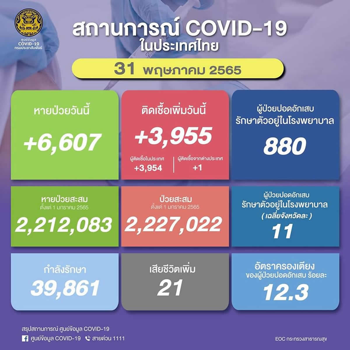 タイ保健省は2022年5月31日(火)朝、1日で確認された新型コロナウイルス陽性者が3,955人で、21人が死亡したと発表しました。また、回復したのは6,607人です。