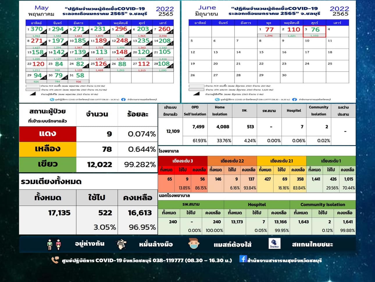タイ東部チョンブリ県は2022年6月3日(金)早朝、新型コロナウイルスの最新の感染状況を発表しました。