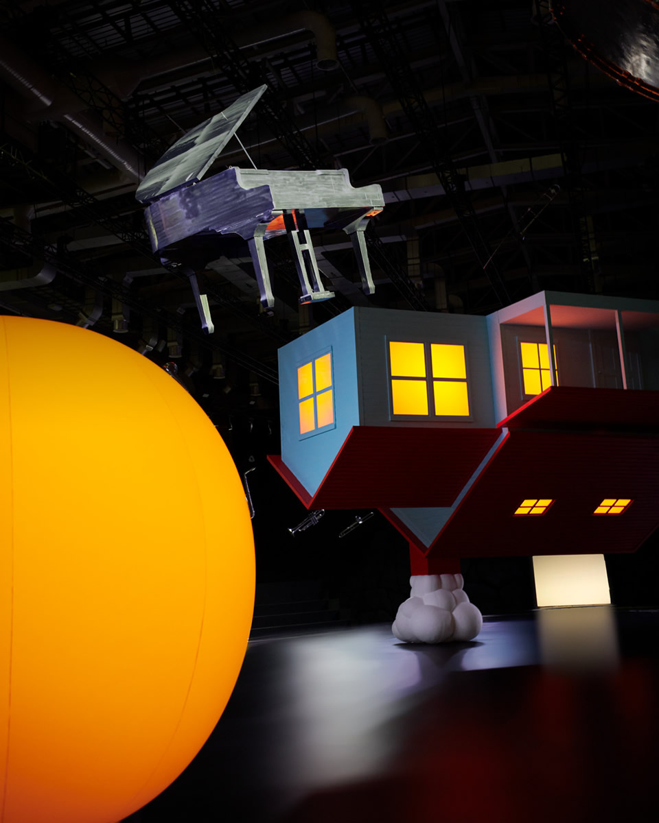 舞台セットの周りを回る太陽、円周型のランウェイを行き交うモデル、そして、夢のような天空の世界で惑星のように楽器が浮遊します。