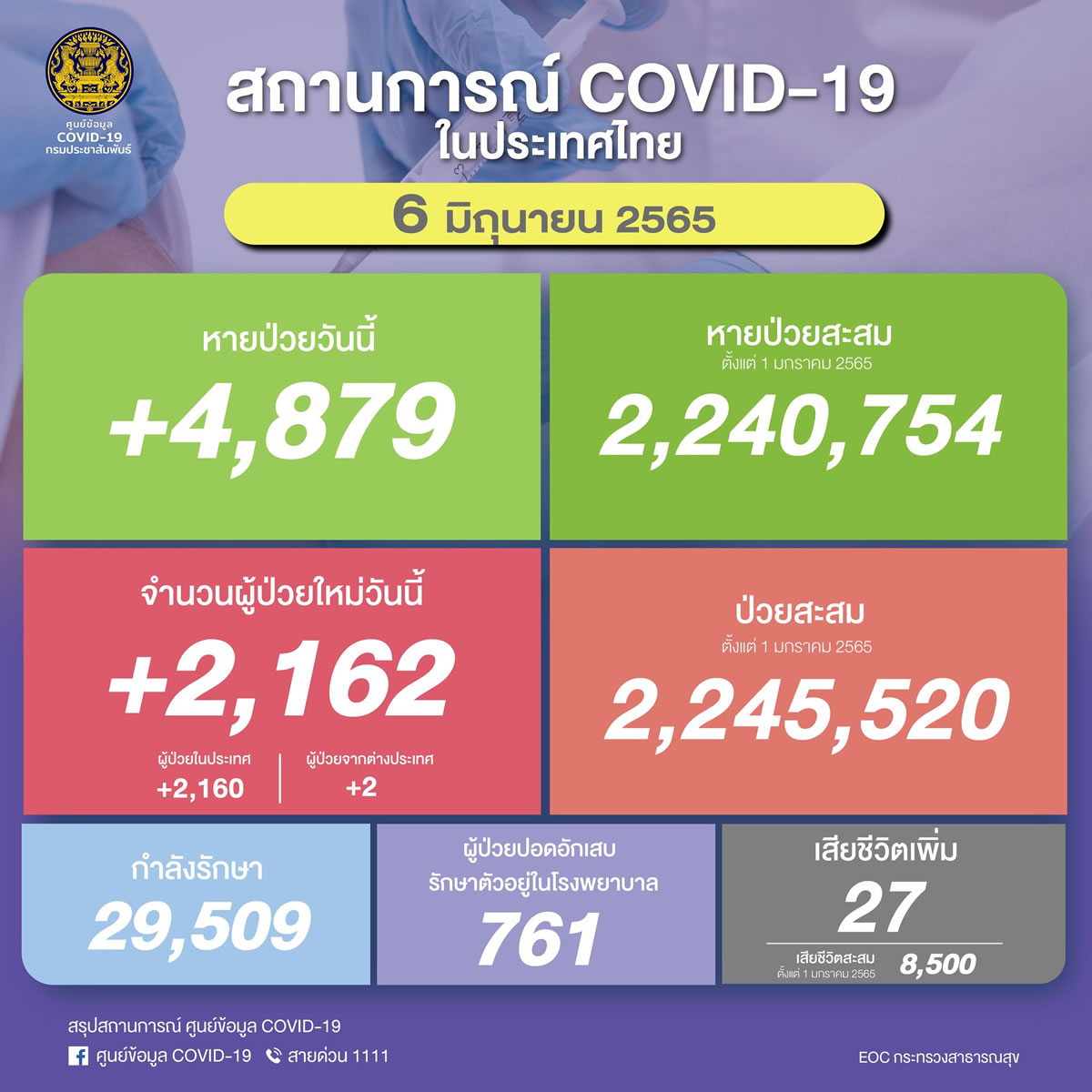 タイ保健省は2022年6月6日(月)朝、1日で確認された新型コロナウイルス陽性者が2,162人(海外から到着が2人)で、27人が死亡したと発表しました。また、回復したのは4,879人です。