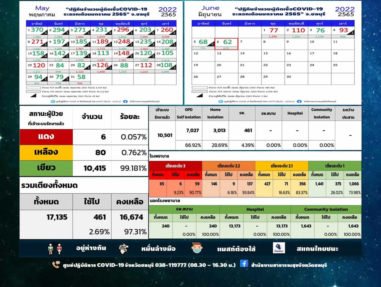 タイ東部チョンブリ県は2022年6月6日(月)早朝、新型コロナウイルスの最新の感染状況を発表しました。