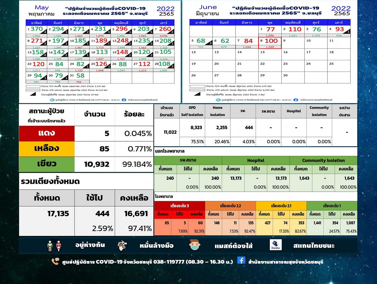 タイ東部チョンブリ県は2022年6月8日(水)早朝、新型コロナウイルスの最新の感染状況を発表しました。