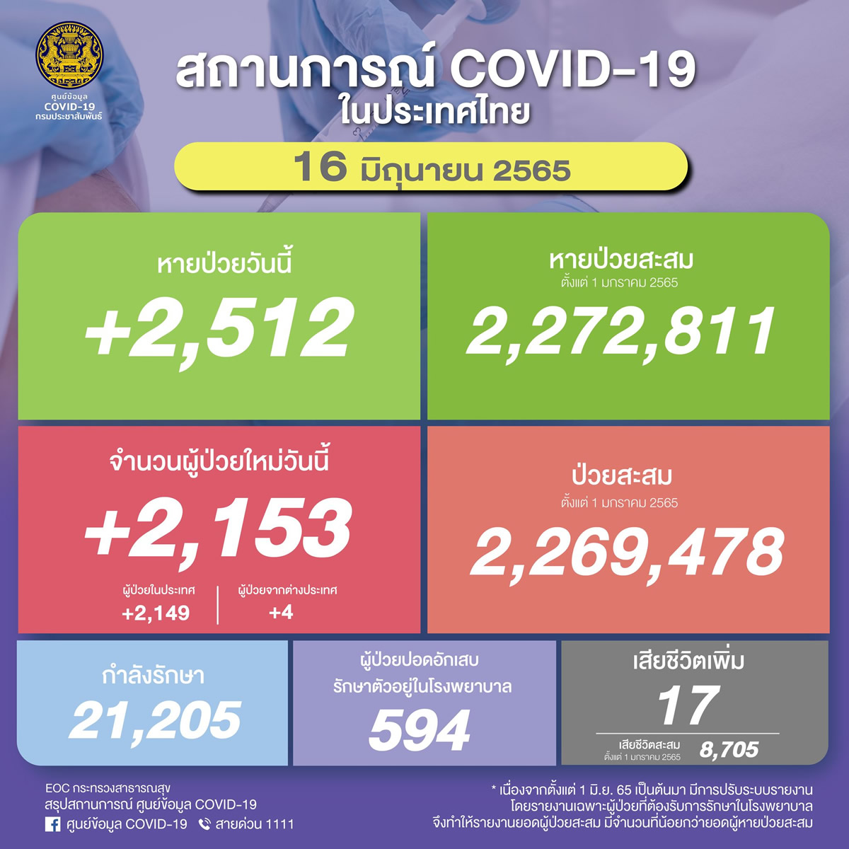 タイ保健省は2022年6月16日(木)、1日で確認された新型コロナウイルス陽性者が2,153人(海外から到着が4人)で、17人が死亡したと発表しました。また、回復したのは2,512人です。