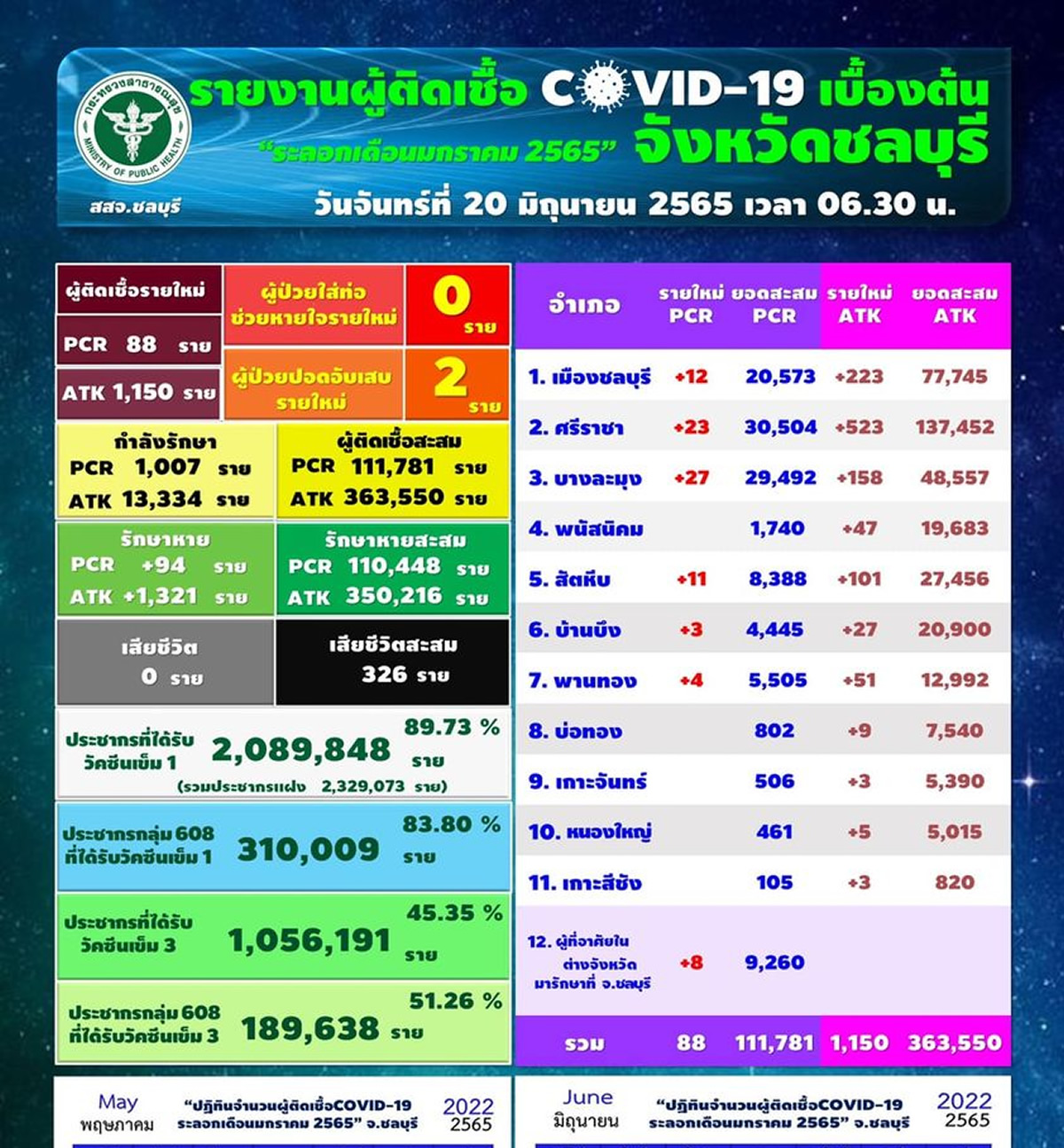 タイ東部チョンブリ県は2022年6月20日(月)、新型コロナウイルスの最新の感染状況を発表しました。