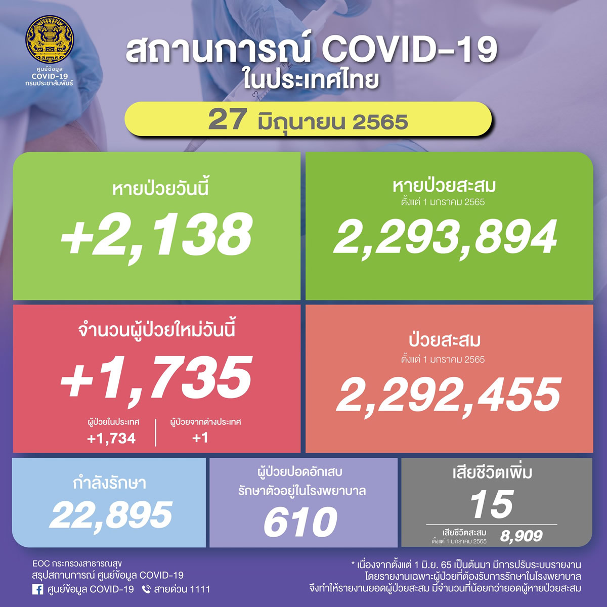 タイ保健省は2022年6月27日(月)、1日で確認された新型コロナウイルス陽性者が1,735人(海外から到着が1人)で、15人が死亡したと発表しました。また、回復したのは2,138人です。