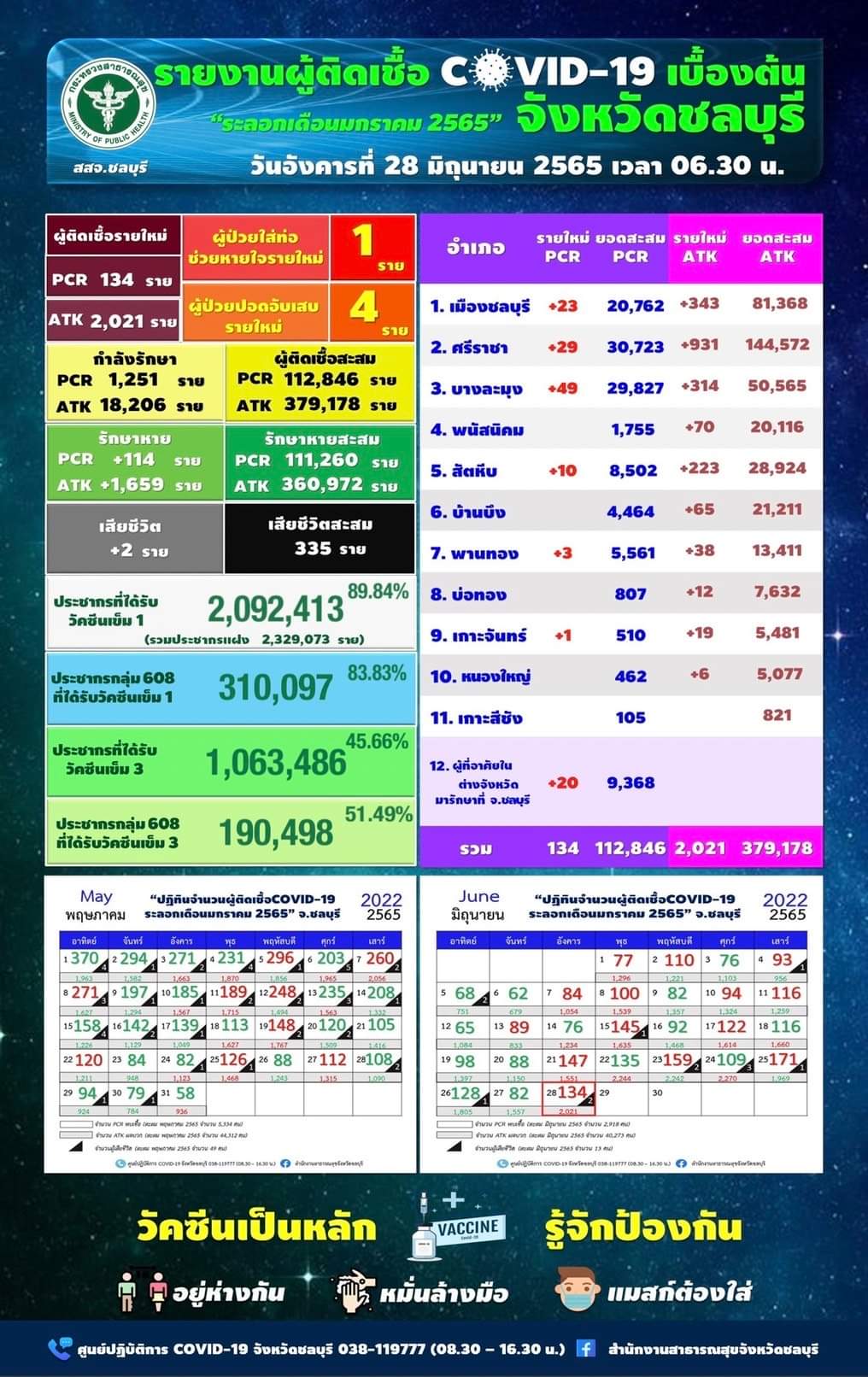 チョンブリ県134人陽性/ムアン23人/シラチャ28人/パタヤ49人[2022年6月28日]