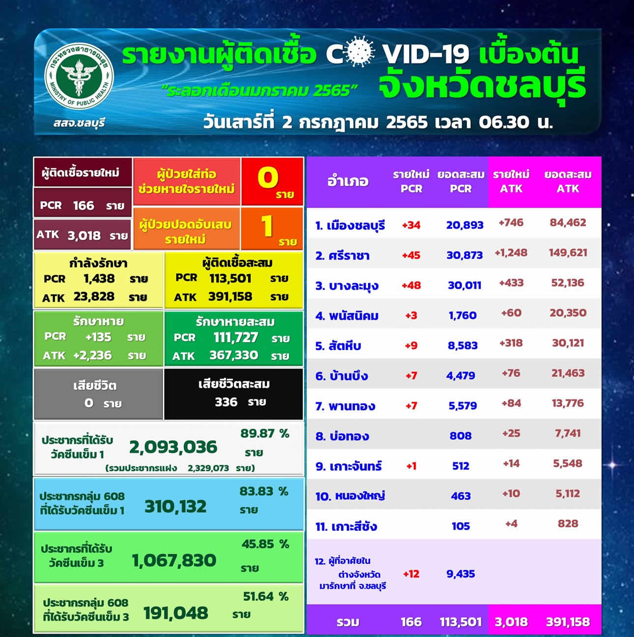 วันนี้จังหวัดชลบุรีมีรายงานผู้ติดเชื้อโควิด-19 ยืนยันรายใหม่ RT-PCR จำนวน 166 ราย ผู้เข้าข่ายติดเชื้อโควิด-19 ATK 3,018 …